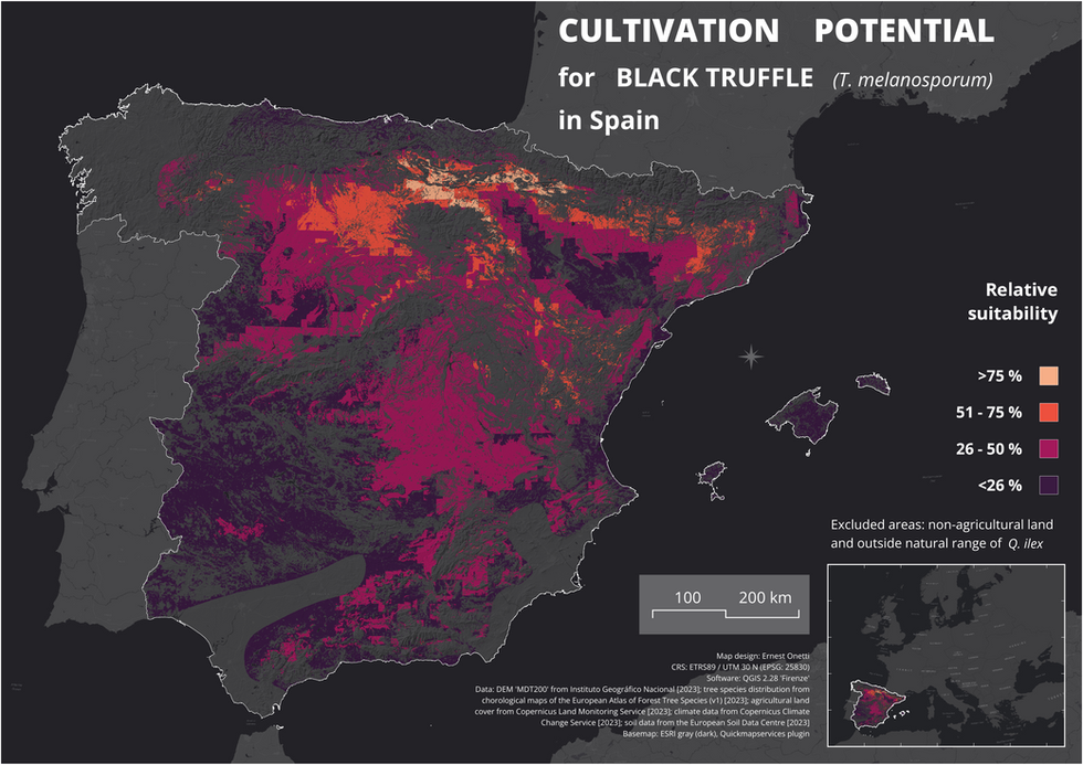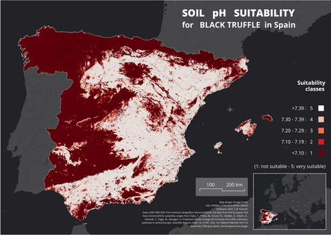 Truffles are soil fungi that grow in symbiosis with the roots of some forest trees. They are sensitive to climate, elevation and soil properties like pH. Here is a selection of the maps that I elaborated for the final project of the course 'Spatial Data Studio'. The goal was to create a country-wide dataset about the suitability for black truffle (Tuber melanosporum) cultivation and identify the provinces with higher potential.